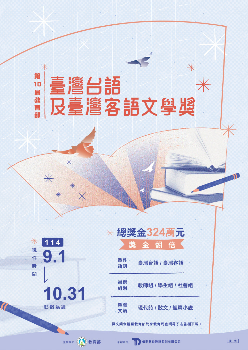 三、 | 首揭文學獎徵稿期程自114年9月1日起至10月31日止,活動新聞稿、簡章及海報,請參見附件。另有關旨揭文學獎歷屆得獎作品集,已公布在「教育部語文成果網」(https://language.moe.gov.tw/)—「語文推廣類」—「臺灣本土語言文學獎」單元項下。 |