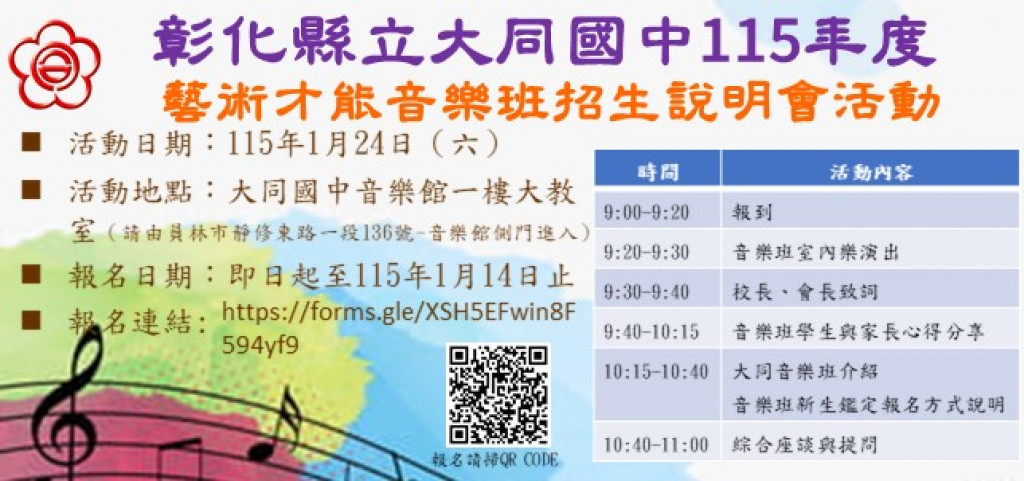| 一、 | 彰化縣立大同國民中學將於 115年1月24日(星期六)辦理 「大同國中115年藝術才能音樂班招生說明會活動」,請有意報考的國小五、六年級學生及家長並鼓勵參加。本活動報名時間為即日起至 115年1月14日止 ,一律採google 表單進行線上報名,網址 : https://forms.gle/4xPPTLZ6Hmvh9Re5A。 |